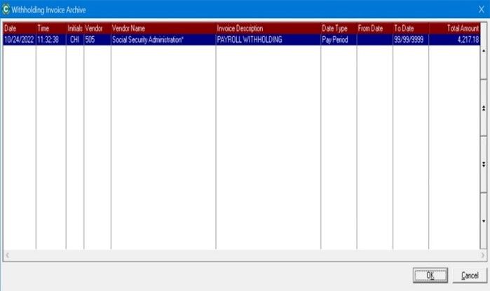 Withholding Invoice Archive: This is located on the Utilities sub-menu under File. This will allow the user to view the details of the previously created withholding invoices via the archive. Only withholding invoices created in CHIPS 22 or later will be available to view in the Withholding Invoice Archive.